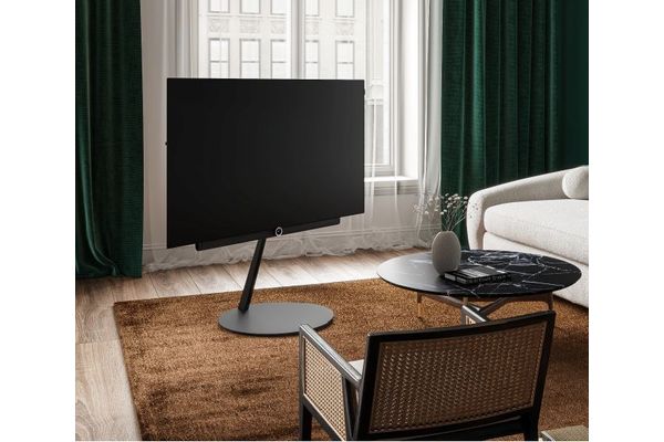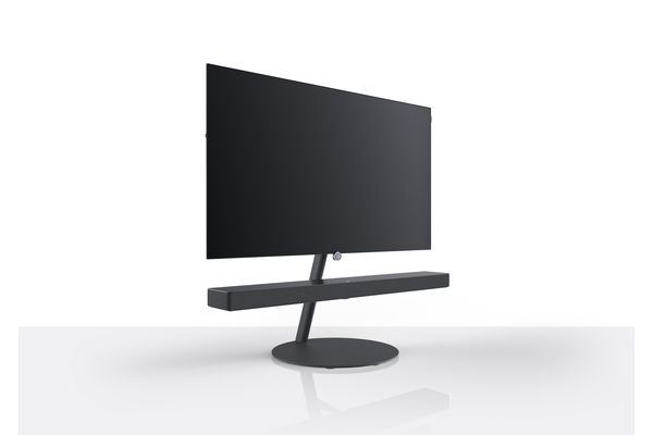 Schräg nach hinten verlaufender Ständer, welcher eine Kabelführung und einen drehbaren Bodenteller beinhaltet. So sind die Kabel vom TV bis zum Boden sauber verstaubar und das Tablar oder die Soundbar (optional) bewegen mit dem TV mit, wenn der Floorstand gedreht wird.